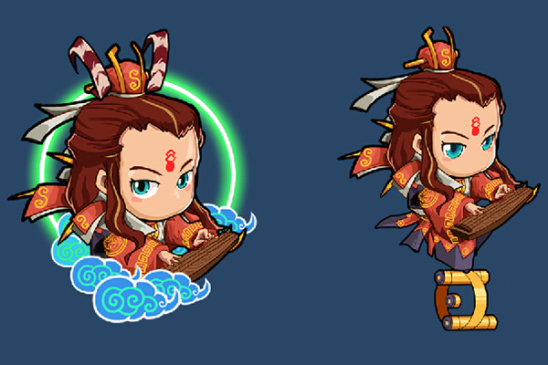 摩昂太子, 西海龙王敖闰之子,小白龙的同父异母大哥,为人忠勇,不徇私情,曾解救唐僧师徒。韩国兄弟一定看了86版的《西游记》,居然还知道这号人物。此太子身着紫红锦缎秀袍,头戴凤翅冠,棕色长发随风飘洒,粉、黄双色挑染更是提了一笔亮色,发尾略烫大波浪,额前朱砂双棱印,蓝色忧郁眼神,真可谓飘飘公子,时尚男神,西游圈的洗剪吹非他莫属了吧!也许是衬托他潇洒的风韵,韩国兄弟把三棱锏换成了一只古琴,恩,有韵味……只是不知他足下所驾何物呀?黄金马蹄铁吗?看在你那么帅萌的份上,好吧,一个字,帅呆啦!
