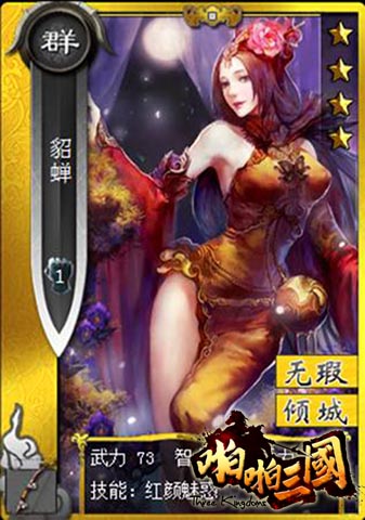 说貂蝉是三国美女的No.1恐怕没有人会有太多异议,貂蝉的影响已经不仅仅是在三国时代,已名列中国古代四大美女之一。有着闭月之貌的貂蝉是标准意义上的白富美。貂蝉略施小计就使得一代枭雄董卓和三国第一猛将吕布自相残杀,此美人计更胜百万雄兵。在《啪啪三国》中,貂蝉也是一张实力不俗的卡牌,外观的设计就是一个妖艳无比,瞅一眼就让万千男性血脉喷张的大美女,另外作为随从时对吕布和董卓还有联协额外加成,这样一位集美貌和智慧于一身的貂蝉谁会不想据为己有呢。