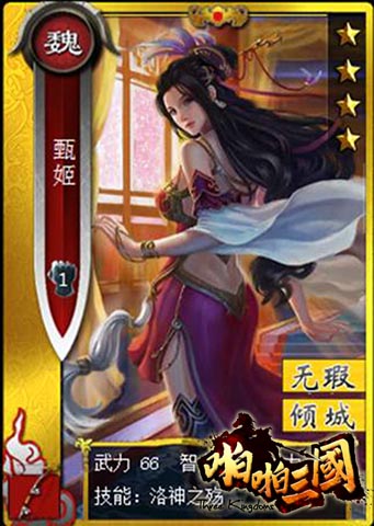 我们将要介绍的No.3甄姬,该大美女名气也是不小,古时就有河北有甄氏江南有二乔的美誉。在当年战火纷飞的年代,甄姬相继邂逅了雄霸天下的曹氏父子,才华横溢的曹植更是为她做出了流传千古的《洛神赋》,后成为魏文帝曹丕的正室。在《啪啪三国》中,甄姬给人的感觉是一种万花从中过片叶不沾身的那种成熟御姐范儿,是一张多用牌,主动技能对敌方主将的持续伤害能力,并且拥有与貂蝉一样变态的双被动技能对男性角色伤害提高并且不受负面效果影响。比起貂蝉的仙女范,江南二乔的清纯范,甄姬走的则是御姐范,三款大美女相信一定能满足三国众多男性玩家的视觉享受。