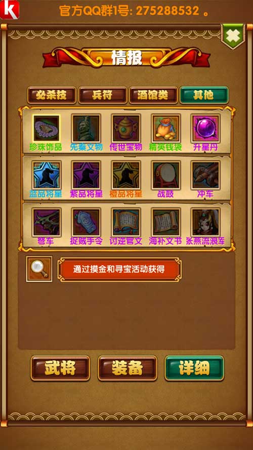 除了使用的武将信息之外,情报系统中还收集了装备目录和道具目录,所有《媚三国》中出现的黄贝和道具,都可以查询到具体的掉落。实乃练级打怪,居家旅行必备良册。