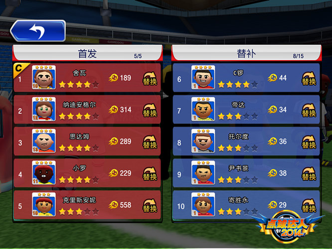 在游戏界面点击自己的形象就可以进入球队选项,目前球员一共分为两类:首发球员和替补球员。其中首发球员最多可以有5名,替补球员共有15名,点击两侧的“替换”按钮就可以完成球员的更换。在游戏中,球员的属性和技能在很大程度上可以直接决定比赛的成败,因此如何在20名球员中选择自己的首发阵容是有一定窍门的。