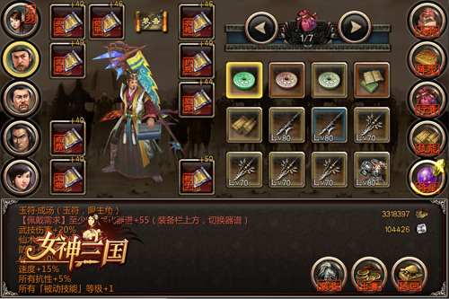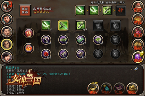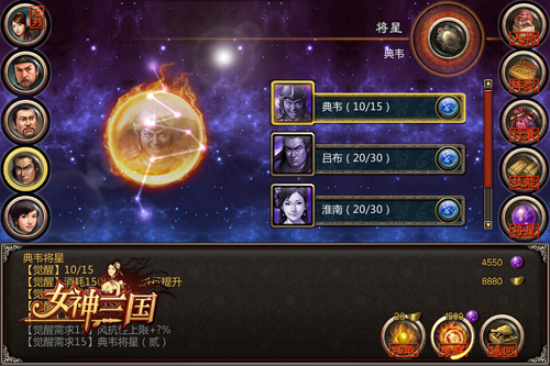 《女神三国》打造超自由化武将成长模式,并形成体系。无论你钟爱哪一位三国英豪,你都可以将其打造成绝世的无双战将,并且每个武将都可以学习其他武将的技能,比如刘备可以学习程普的风水涣,周瑜可以学习荀攸的玄冰盾……当然,想学什么技能,全由自己做主,你甚至可以在武将之间随意切换将星!