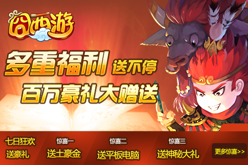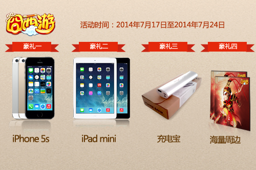 为回馈玩家对游戏的热爱,在《囧西游》新版上线的同时,“决战南天门 百万奖品三重礼 35级直送IPHONE 5S”活动火爆上演。在7月17日至18日活动期间,登陆游戏可参加“充值厚礼”、“签到豪礼”、“乾坤换宝”等活动,换取积分、铜钱及各种游戏道具等丰厚奖励。
