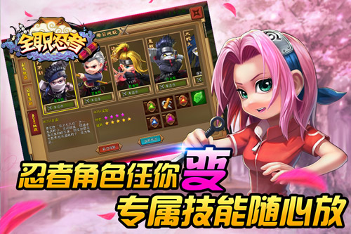 忍者不能按常理来思考,是忍者,就要不拘一格,走出自己的忍道。《全职忍者》独创忍术变身系统,想变谁就变谁。只要收集到变身碎片,分分钟就能改变容貌。《全职忍者》的变身,不仅局限于形态容貌改变,更重要的是,玩家将能继承角色的终极忍术,100%触发,秒杀对手。