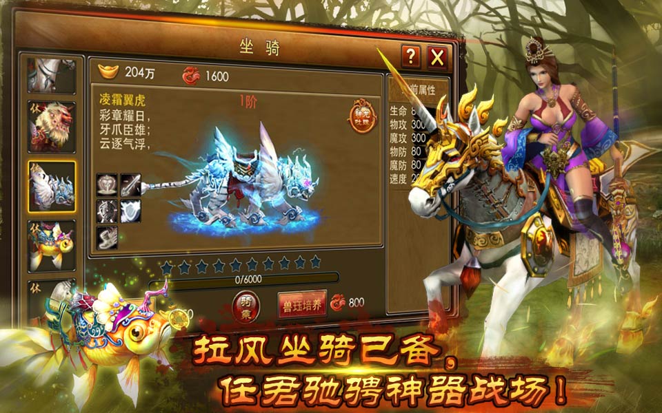 坐骑系统作为《神器来了》中重要的玩法之一,在玩家达到12级时,完成主线任务后就会自动开启坐骑,面对现游戏市面上各种奇形怪状的坐骑,《神器来了》既遵循了传统路线,按照武侠风格展现坐骑。也加入自身的创新理念,从一阶起步的拳毛騧,到越来越狂放的三阶坐骑白蹄乌,直到最后的五阶神兽飒露紫!完美地将武侠、仙侠融合一起,感觉萌萌哒!当你在朋友圈上晒照神兽坐骑时,就让那些晒车晒房的小伙伴们都惊呆吧!