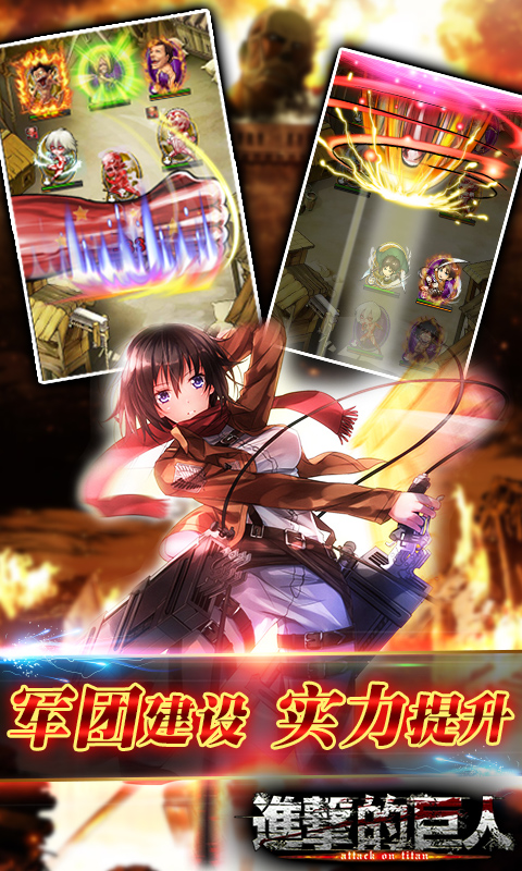 由全球上百万动漫迷追捧的火爆动漫改编的同名手游《进击的巨人》人气不断爆棚,公测以来众多玩家在线上打响复仇之战!与此同时,军团系统即将上线,大战迫在眉睫,全线玩家集结,整装待发准备作战!这一场人类反击战不能幸免,为了让人类能够安定的生存,运用军团的力量,把巨人一个不留的驱逐出去!
