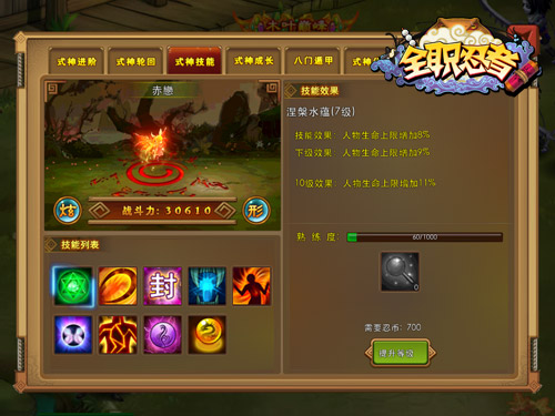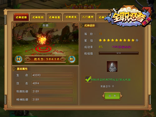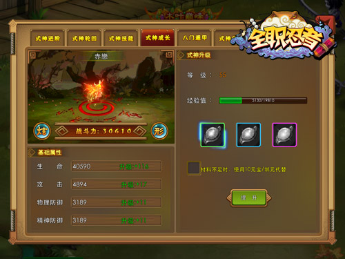提高式神的轮回次数,可解封更多的式神装备,提升式神装备的闪耀(强化)等级。式神升级后,将会按配置提升人物的基础属性:生命、攻击、幻术防御、忍术防御。