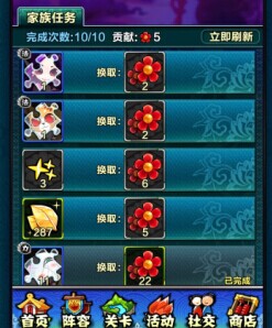 除此之外,游戏中每天向每个已加入家族的玩家还会发布随机任务,限完成次数,每天定时刷新任务内容,完成后就可获得对应数量的贡献度奖励。玩家完成每日家族任务获取家族贡献度后,还可以在家族商店中购买珍稀随机物品。