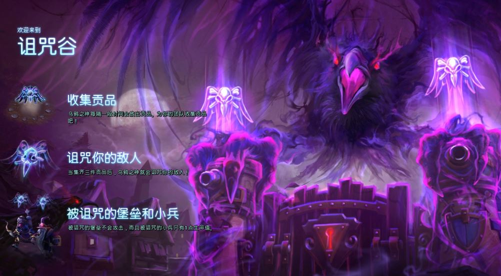 诅咒谷是一个经常需要打团的地图,所以阵容一定不要选前期打团很弱的阵容不然容易被压制,这张地图对奶妈的需求特别大,最好配合一个能消耗的奶妈,比如玛法里奥,乌瑟尔,丽丽等。游戏开始2分钟的时候看一下自己状态,因为马上要刷新贡品了。刷新贡品之前要提前5人集合速度摆好阵型,先打团击杀对方英雄再拿贡品,切记不要深追,以拿贡品为主。也可以考虑4人拖对方5人让己方一人去线上吃经验的战术。合理运用打野的时机牵制对方发动的诅咒效果。这个地图经验非常重要。10级是一个关键点,所以一定要吃好线上经验。发动诅咒效果需要3个贡品,实在抢不到的情况下该放则放,转身回去打野,吃经验最好。一旦诅咒了对方就以拆塔为主反对方野怪为辅。不要轻言放弃每场战斗,坚持就是胜利。
