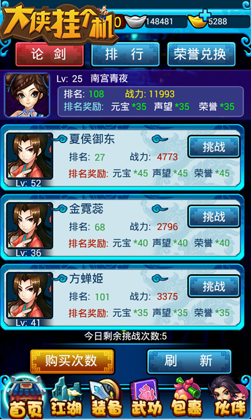 点击“论剑”,战力达到1000以上便可以看到进入竞技场。在这里你可以挑战3个名次和你差不多的玩家,这些玩家是系统推荐的。当然如果在服务器早期系统推荐的很多都是系统的电脑人,电脑人位列前茅但是战力非常低,轻松打败他们便能提升到该名次。当然每天挑战次数是有限的,每个玩家每日只能挑战五次,挑战完之后还想挑战是需要购买“挑战次数的”。根据VIP等级的不同,大侠们每天购买的次数也是不同的。玩家若想快速提升名次,多刷新几次选择位列前面的,战力又低的来进行挑战是最合适不过的了!