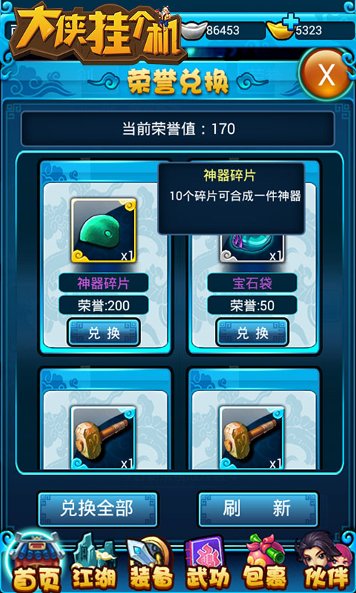 论剑里的不同的排名可以获得的奖励也不同,排名的奖励每天发放一次,奖励包括“元宝”、“声望”和“荣誉”。获得的荣誉值可以点击“荣誉兑换”进行兑换,在这里大侠们可以用荣誉值兑换到神器碎片、宝石袋、金银铜锤等等!若觉得都不中意还可以点击刷新,消耗10点荣誉便可以刷新当前页面。