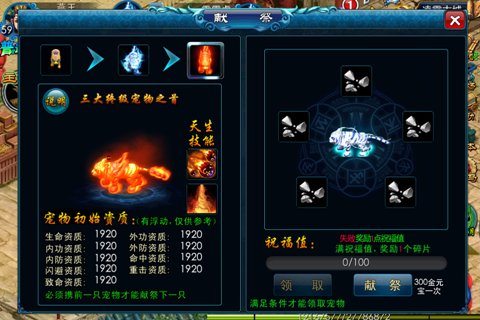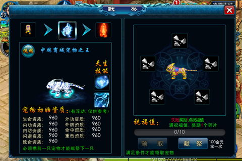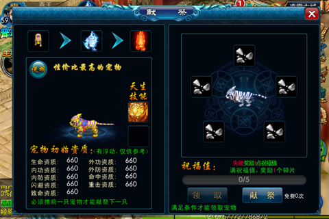 小白虎通过“白虎献祭”,集齐了足够的碎片之后,就能兑换小金虎了。小金虎可谓是整个游戏最具性价比的宠物,初级的献祭并不需要多少资源,玩家能够很轻易地获得。它的资质上限全面超越了小白虎,技能“虎啸山林”更是威力不凡。