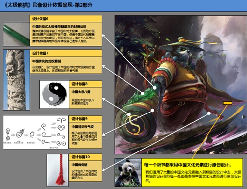 蜗牛负责人介绍,《太极熊猫》主角熊猫形象的设计灵感源自中国传统文化,主要通过在细节上参考公众认知的特色而进行原创设计。太极熊猫的穿戴饰品上分别融入了裹头、斗笠、武器葫芦、珠串、唐装、和式太极棒、龙纹雕刻、太极八卦、楚汉云气纹、中国结等传统文化符号,显然具备更为纯粹的中国血统,这些中国特有的文化表达方式,在《魔兽世界》熊猫人形象上是看不到的,两者有着显著的差异。为此,蜗牛相关美术人员对小编进行了详细说明如下: