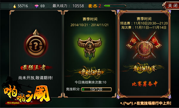 《啪啪三国》的竞技场采用段位匹配制度,同一个段位,匹配战力相近的对手。青铜、白银、黄金、大师,以累积的积分来进行晋级,赢得15积分,输了扣10分。晋级的时候还会有BO5的进阶赛,整个竞技场的制度已经非常的先进和成熟。