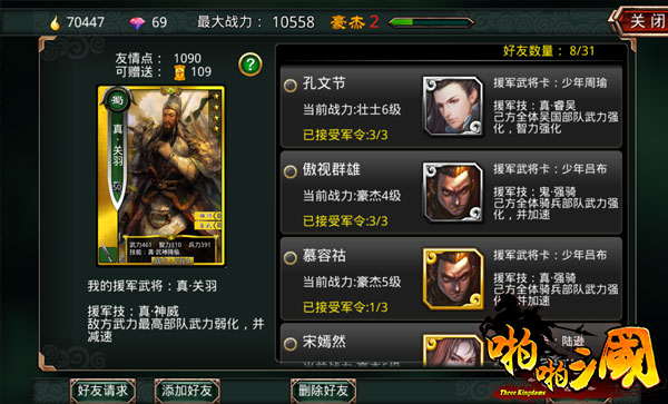 公会与好友系统是大多数网游都具备的基本社交元素。啪啪三国有个很特别的地方,就是每次打关卡之前,都可以选择一位援军,在战斗结束的时候可以向这位援军发送好友请求。如果你的援军就是你的好友,就会获得友情点,互相赠送军令。而公会则在最新的一个版本中推出了公会副本系统,公会所有玩家可以一同联手同仇敌忾,加深彼此的兄弟情义。