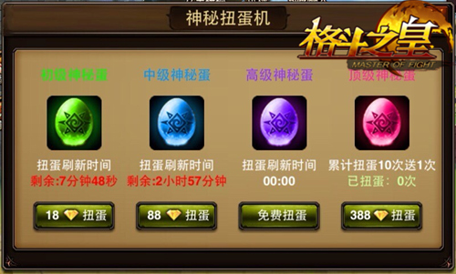 新增加的扭蛋系统可谓是最省时省力的获取暗金幻兽利器!但同时也是一个拼人品利器!这货可以在一定时间内免费扭蛋,也可以直接使用金钻开启扭蛋,不同扭蛋可以开出不同的物品,人品好的话最暗金幻兽能直接免费扭出来哦!