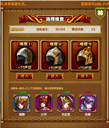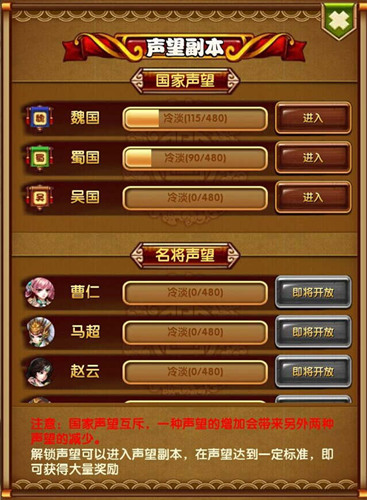 玩家等级达到50级即可解锁声望副本,本次首先开启的是国家声望,魏、蜀、吴三国,每个国家每天可进入两次,通过战役获得声望值。战役根据难度不同分为三个级别,难度越高,获得的声望也就越高。另外,通过捐赠相应物品也可获得声望。需要注意的是,国家声望互斥,一种声望的增加会带来其他两种声望的减少。