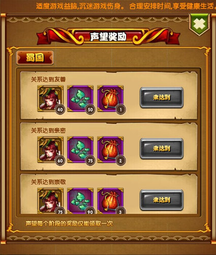 声望可用来兑换将魂、神兵碎片、元宝等高价值奖励,随着声望值的升高,玩家与国家的关系也会由冷淡发展为友善、亲密、崇敬、崇拜,关系越亲密领取的奖励越高。