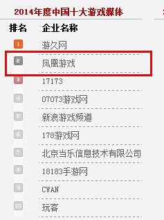 2014年度中国十大游戏媒体:凤凰游戏