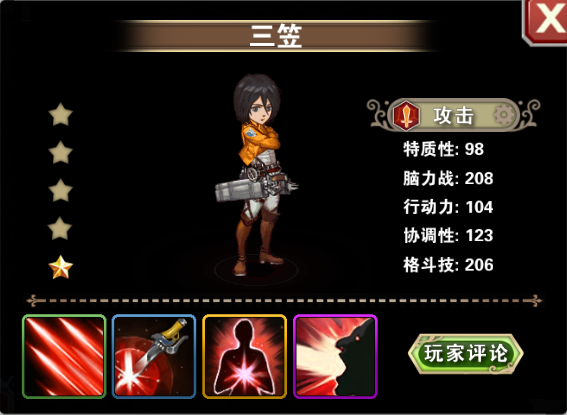 根据著名的日本动漫《进击的巨人》改编的手机同人动作卡牌游戏《进击的巨人Ol》已经于2014年11月10日正式开启封测,该游戏摒弃了传统的q版萌版原著形象的方式,而是高度贴合原著动画,采用写实人物真刀真枪PK的方式,战斗副本采用跑酷战斗副本模式,可谓真正的改编游戏。那么,熟悉《进击的巨人》这款动画的童鞋,一定熟悉里面战斗力爆表兵长利威尔阿克曼、三笠阿克曼已经艾伦耶格尔这三位人气超高的角色。那么具体的在这款精品游戏中,这三位人物的战斗属性又是怎样的呢?下面小编就罗列几点,让大家一览无遗。