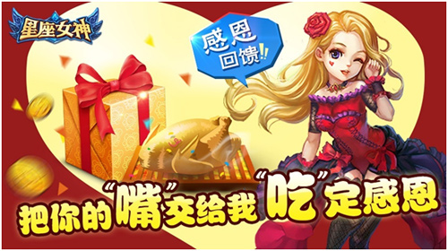 女神的第一个感恩节已经悄悄到来,心怀感恩一路有你!不知不觉《星座女神》已走过半年的精彩时光,感谢各位英雄一直以来的支持与陪伴,女神准备多重感恩节豪礼回馈各位新老玩家。除了百万礼包之外,广大吃货们还有更大的福利哦——就是香喷喷的烤火鸡(*^__^*) 。