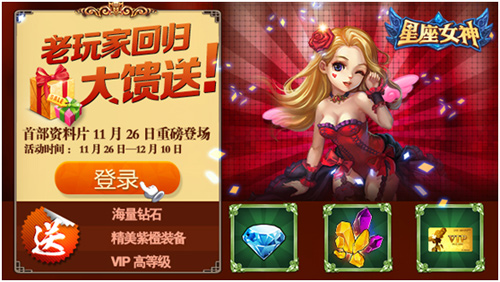 女神的第一个感恩节,同时也是《星座女神》的半年庆!为回馈广大老玩家对游戏的厚爱,我们将在11月27日感恩节当天推出“回归”活动,开服一个月以上的服务器玩家只要回归,《星座女神》福利给你送到家。海量游戏币钻石大胆领,角色等级瞬间直升,装备属性轻松到位,精彩纷呈,一起为荣耀再战巅峰!