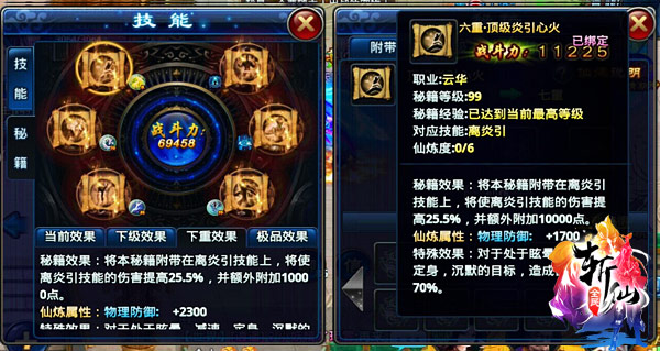 每本橙色秘籍仙炼后,可增加1点仙炼值,还可增加人物的固定属性。每提升1重,都将获得飞跃式属性大提升。而玩家在仙炼时,如果将高重数秘籍仙炼到低重数秘籍上,新的秘籍仙炼值为二者之和,不会让玩家损失一丝一毫的仙炼值。