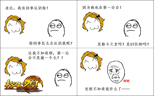 任会长期间,这位《格斗之皇》特别喜欢跟媳妇儿炫耀第一公会会长头衔!他媳妇儿是个游戏盲。有一天他媳妇儿兴匆匆跟他说:“老公,我同事认识你哦!”他很疑惑地问:“你同事怎么会认识我?”她接着说:“今天我同事说他也在玩游戏,也是第一公会的哦,你不是会长么?”这位玩家有点狐疑:”他也是57区的?”然后,这位媳妇儿有了闪亮的答案“这我不知道耶,第一公会不是就一个么?”