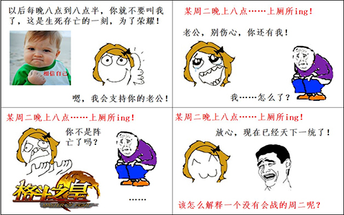 更新了公会战后,这位玩家郑重其事地跟媳妇儿说以后每晚八点到八点半,你就不要叫我了,这是生死存亡的一刻,为了荣耀!他媳妇儿听后,忙点头,还表现出很紧张的样子。之后第一个星期二,八点多了,他从书房走出上厕所,媳妇儿到立马很伤心地跑过来抱着他:“老公,别伤心,还有我在!”他就很疑惑:“你怎么了?”媳妇儿伤心地说“你不是说这是生死存亡的时刻么?你是不是已经挂了?别伤心,还有我在!”