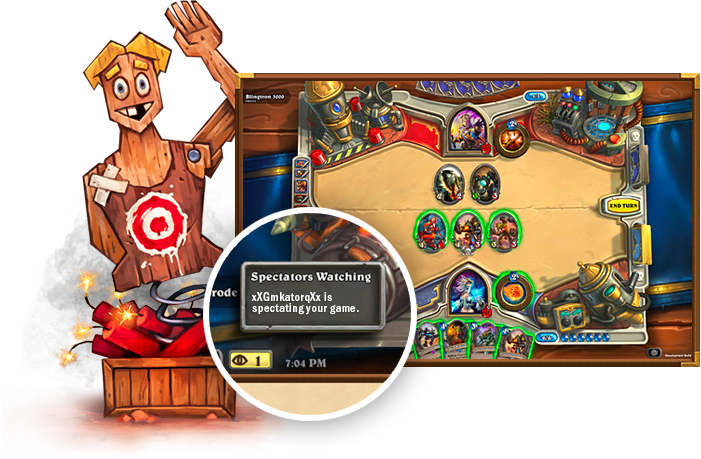 作为观战者,你好像跨越了空间的距离,坐在朋友的电脑前,看着他们左右悬停的卡牌以及他们想要置入战场的随从,通过他们的目标箭头了解他们的出牌思路。你甚至可以看到他们想用的表情,那感觉就跟自己在玩一样。而作为被观战者……你可以选择让观众们见证自己竞技场12胜的光辉瞬间,或者在马上就要被打脸的回合把他们统统“踢出”你的游戏!