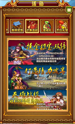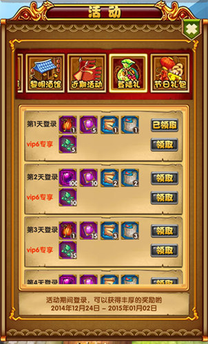 节日大回馈,活动期间,玩家登陆游戏即可领取节日礼包一份,内含元宝、铜钱、橙将碎片、寻龙令牌等珍贵道具。除此之外,12月24日至1月2日,每天都可领取登陆好礼。