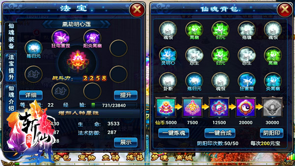 炼魂靠人品,拼运气,当然也讲究技巧。建议仙友手动炼魂,当第三个封印点亮后,先不着急点第四个,而是要将前面两个封印全点亮后再往后点。如此反复操作,直到前面封印全部点亮,再点最后一个。如此操作可提升橙色仙魂出现概率。炼出橙色仙魂只是第一步,玩家还要不断给仙魂升级。当所有橙色仙魂满级后,你的战斗力早已提升了不止一个档次。