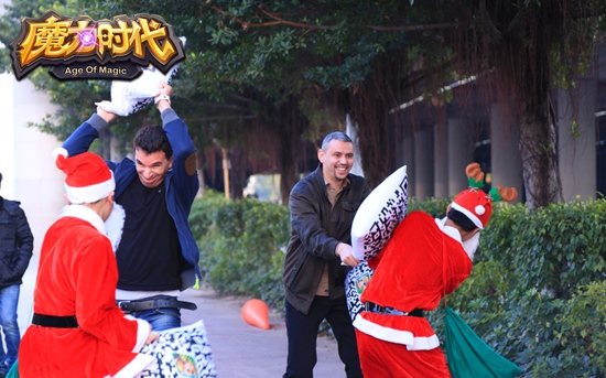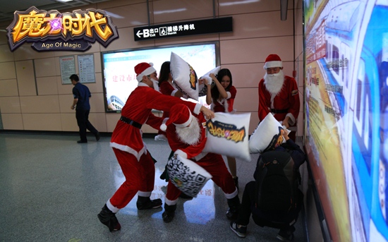 从24号下午,三位圣诞老人和两位俏女郎就已经穿上了最标准的圣诞装扮,给过往的行人派送礼物了,相信有不少玩家遇到了他们。看到成堆的礼物,兴奋吗?不过,想获得圣诞礼物,要先通过圣诞老人和圣诞女郎的小整蛊——枕头大战。