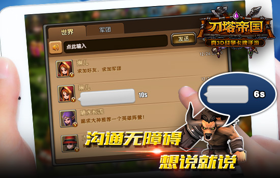 玩家对交流的需求日益增加,《刀塔帝国》首次更新聊天系统后就加入了语音互动这一强力补充,给枯燥乏味的文字聊天系统注入全新活力。摆脱了文字枷锁的聊天系统更为随性,想说什么就说什么,新潮好玩就是任性!
