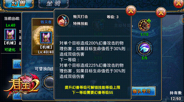 1、毁灭打击(特殊技能):对单个目标造成200%幻宠攻击的物理伤害(目前是第3级,按照目前最高宠物90级能升到第6级有275%的幻兽攻击),如果目标生命值低于30%则造成2倍伤害,就是说最大能造成400%(90级时最高550%)幻宠攻击。