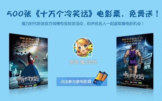 《十万个冷笑话》大电影今日全国上映,你还没有电影票吗?由《十万个冷笑话》原班声优献声的3D次世代冒险手游《魔力时代》携手声优,赠送500张大电影票,还等什么,赶紧领取电影票,边看电影边玩游戏,不变的声音,不变的吐槽恶搞无节操,真可谓“游戏玩得真爽快,都来自挂东南枝”!