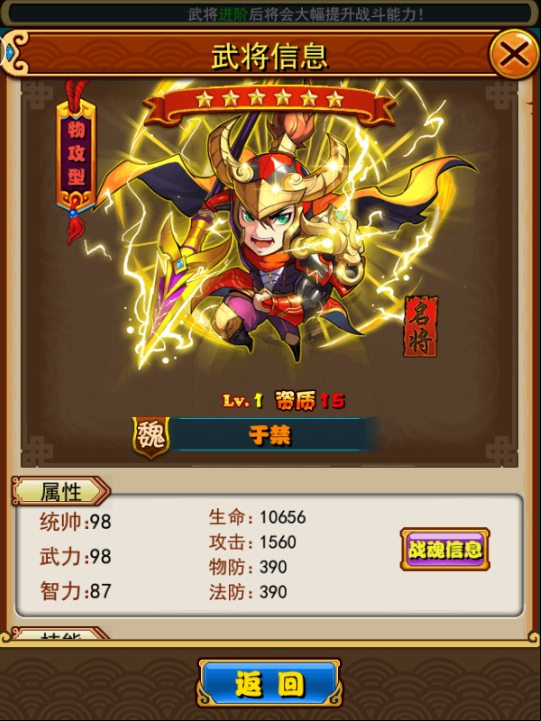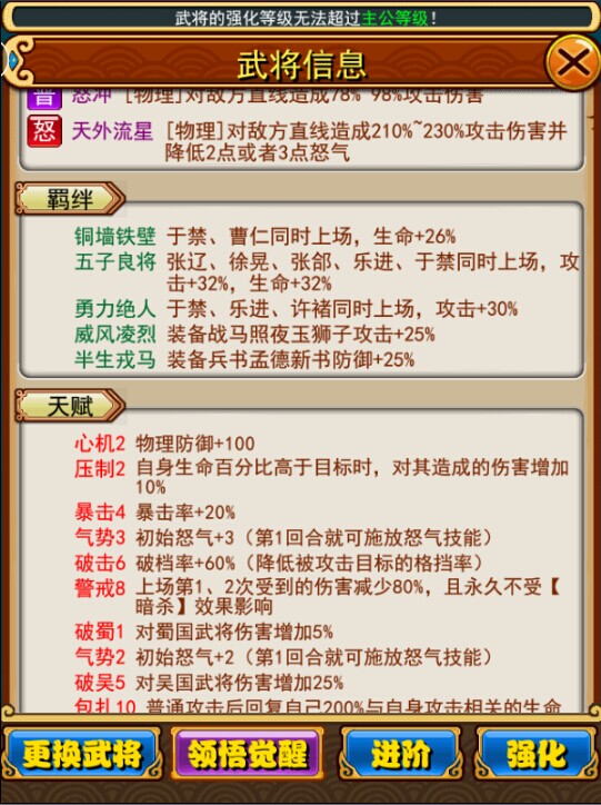 3. 天赋。从+2和+7天赋就可以看得出,于大爷天生就是T,高防减伤比较好的承担起了前排肉盾的作用。同时有压制和暴击率的存在,提升了在战场上的输出。这就是优于夏侯的地方。但我还是喜欢夏侯的+7天赋。