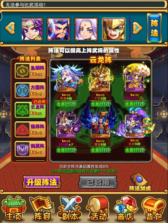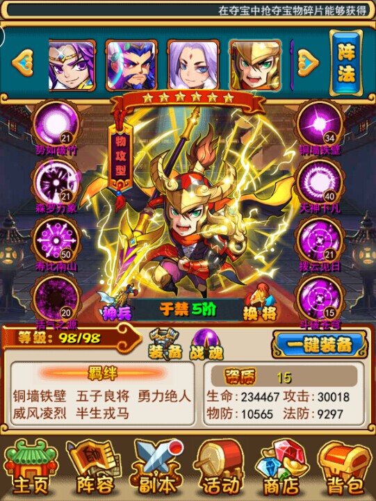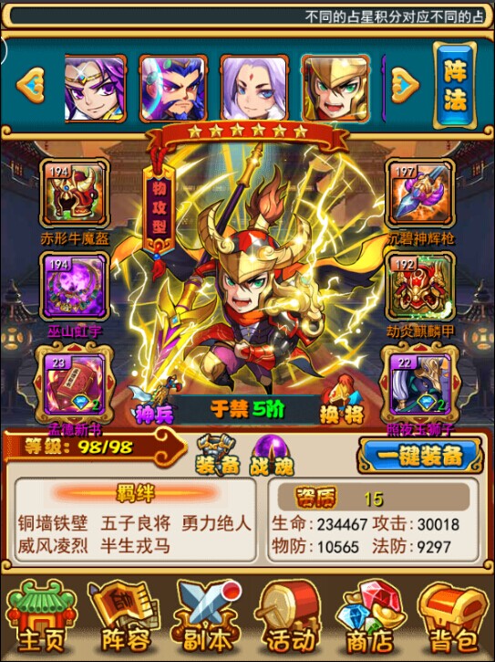 楼主在360专区,算是个老玩家,但手一直比较黑,V7也只有57w战力。从开始魏国,一直到现在。祸不单行,在押魏国限时的时候果断把所有家粮上交给了司马,导致现在一直无法上张辽。且在93级的时候才出第一个天神下凡,DS气息淋漓尽致的体现出来了。3、4天前,我在群里问各路大神,要不要上于禁,替代疲软的夏侯将军。得到了比较肯定的回复,索性在半个小时内,换将、重生武将、重生书马等一些列操作后,成功的把C5于禁安排到了阵容当中。这两天一直处于试玩阶段,况且节假日事情多,整的现在才有时间更新。