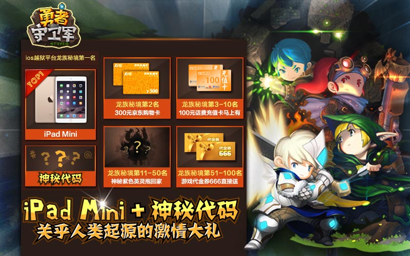 奖励升级,激情升温!试玩《勇者守卫军》更有机会获得iPad Mini、京东购物卡、神秘代码等超值实物大奖!