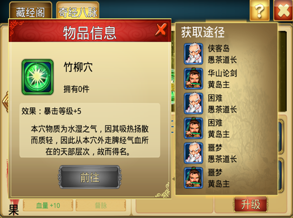 在达到相应门派等级时会开启相应的经脉,而用来升级经脉的穴位,在打副本中的相应关卡时有几率掉落。凑齐每个经脉所需的4个穴位就可以升级经脉,升级经脉会增加闪避、命中、伤害、暴击、韧性等。当然大家也不需要在打穴位的时候在所有副本中找寻穴位的出处,只需要进入奇经八脉,点击你想搜集的穴位就会出现会掉落这个穴位的副本关卡,点击前往,你就会直接到达相应的副本中,是不是很方便呢?