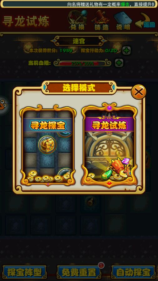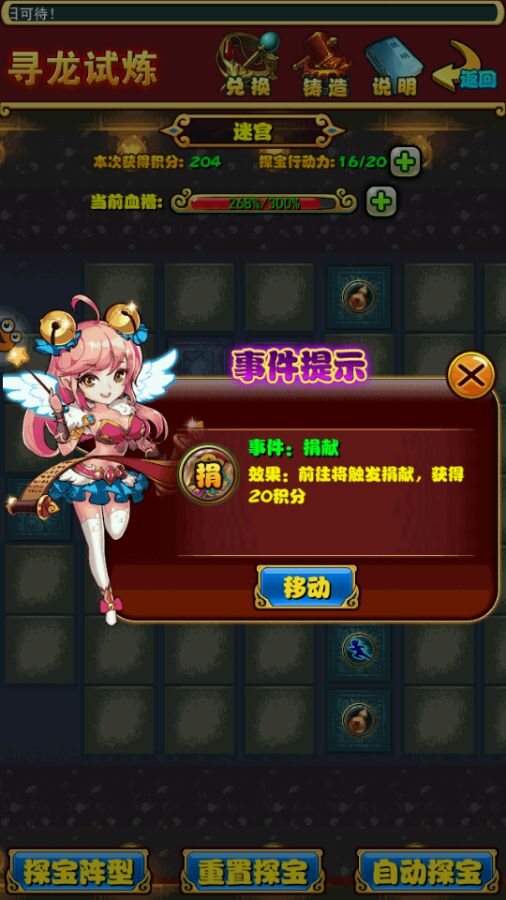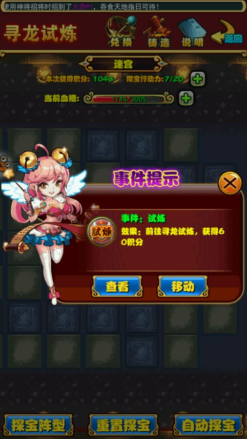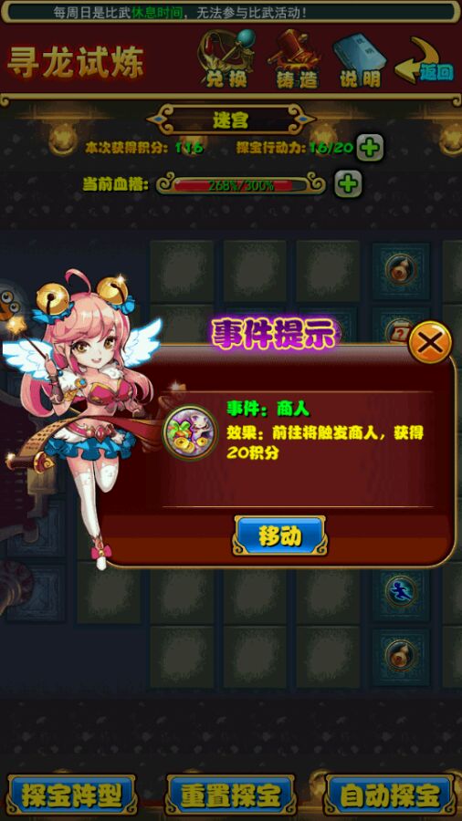 选择试炼后,一开始的界面和探宝一样。初始20步,一直走到终点,这里就不是下一层了,点击进入闯关模式。