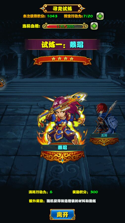 第二关,蓝色文聘。54万战力。消耗8步可以进攻。过关后材料数量不变。积分400。要说明的是,如果步数不够,就只有直接结束试炼了。这点跟探宝不同,探宝可以一次一次买步数。买一步,走一步,拿一点分。