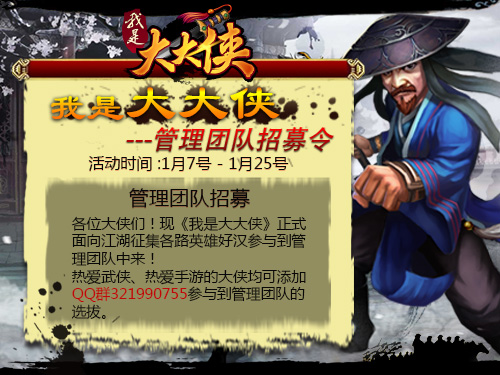 现《我是大大侠》面向广大WP玩家招募玩家管理员,热爱手游,热爱武侠的小伙伴们均可加入《我是大大侠》玩家管理团队QQ群:321990755,之后将逐步进行考核,招募时间截止至1月25结束。丰厚的“工资”等你来拿哦~