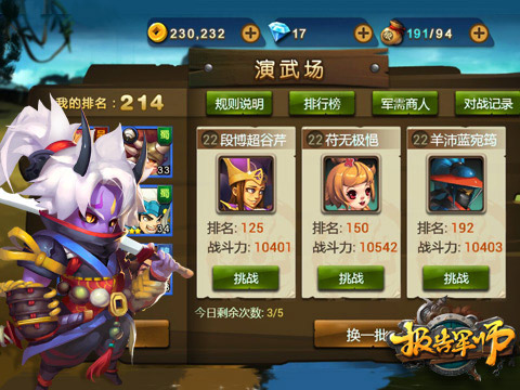 《报告军师》“演武场”排名前50名的玩家阵列,被示为“布局模范”,你的布阵将会被全服玩家作为参考,接受大家的敬仰,各种装逼就就是这么随意。