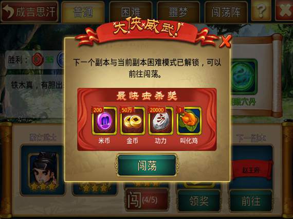 挖掘机技术哪家强,这个就不用说了,地球人都知道。但是副本通关技术哪家强呢?要想成为《幻想武侠》通关副本技术界的蓝翔,大侠们只需掌握一个字,那就是“快”!《幻想武侠》的副本通关后都会有通关奖励,奖励的多少依据你通关的快慢,越快拿到的奖励就越多,如果你是最快通过的,就会得到最快通关奖励。所以别管是2星还是3星过了,最先通关才是王道。