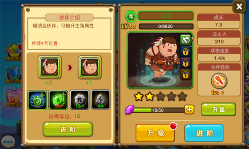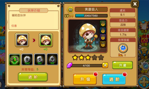 《欧巴带我去冒险》“黄蘑菇人”定位是“攻速流”辅助小伙伴,自身属性为攻击速度1.7/S,技能CD15秒,初始星级成长7.3。主动技能“潜力激发”,技能效果:8秒内增加主角60%的攻击速度(技能每升一级额外提升2%)。60%的攻击速度增幅,配合“星座”系统的攻速加成,主角将有很大机会打出“二段式”攻击判定的效果,大大提高团队作战能力。