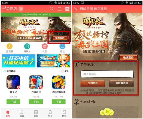 已获得激活码的玩家关注官方微信,手机端可关注官方微信(gyc_shouyou)即可在“激活通道”导航栏进入激活界面。同时为了防止拥堵,《关云长》手游官方与“免商店”展开联动,玩家同样可以登陆免商店进行激活,更可享受到免流量下载的专属特权!