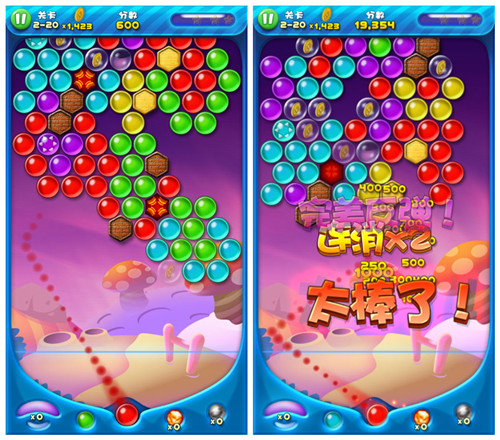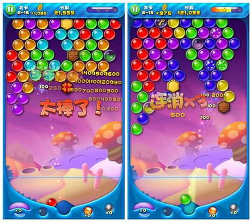 可能很多玩家对泡泡类游戏的印象还停留在画质静止、游戏呆板的旧玩法里,但是新版《泡泡龙萌星大作战》里增加了泡泡Q弹的质地和爽快的动态打击感,让静止的画面一下子跳动起来。想要打出高分或者一次性消除更多的泡泡需要掌握软投射技巧,但一定要避免越用力、越精准,泡泡反弹和生长的速度却越快的困难。当然学会制造泡泡布局同样至关重要,开局就成型的布局是可遇而不可求的,大部分还是要靠熟练地技术打出来一片利好阵营。