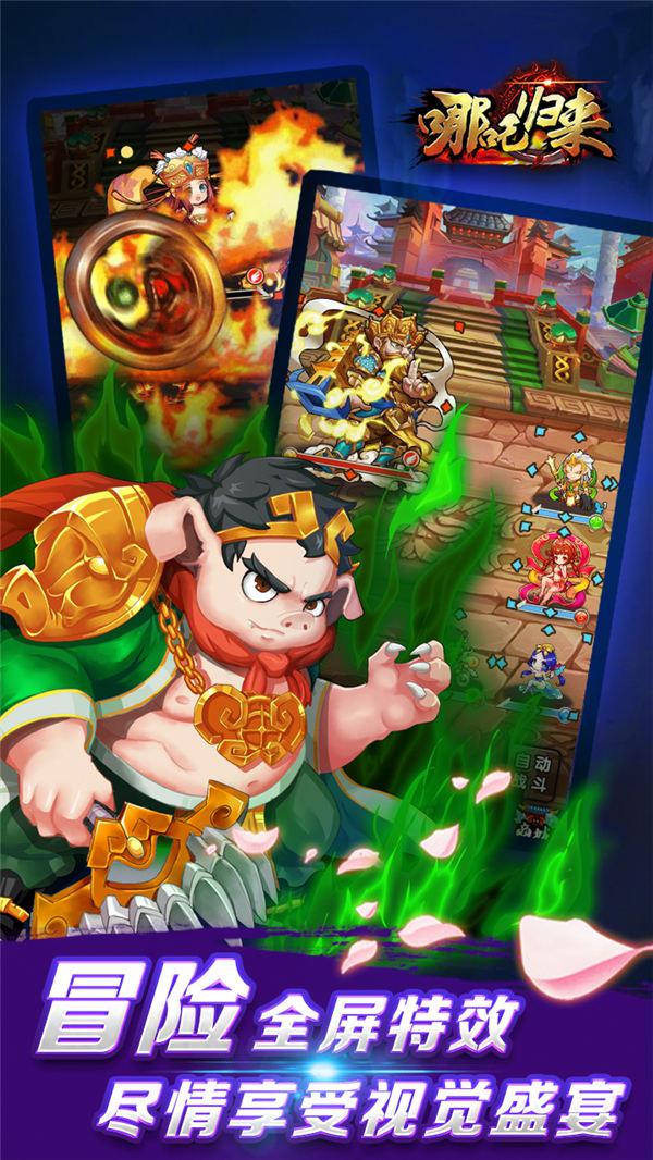 《哪吒归来》是一款2D萌系风格的游戏,游戏画面上相当亮眼,无论在人设、场景,抑或是战斗,相比其它2D画面手游都要出众。战斗过程中每次攻击都会有可爱俏皮的声优配音,让游戏更具代表性。在人物造型上也是相当用心,细节方面也很有考究,像是哪吒脚踏风火轮,身缠混天绫,手握火尖枪的形象还原的相当真实。