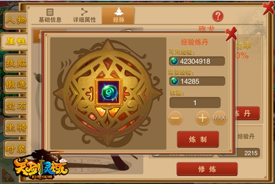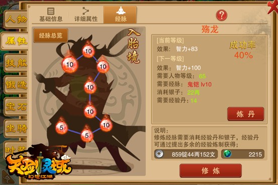 当货币、经验、人物等级达到加点要求的时候,玩家即可根据自身角色情况对经脉进行加点。经脉升级需要依靠经验值的注入,玩家可以借助经验丹来提升经脉等级。值得一提的是,每一条经脉对应一种属性,开启之后属性永久加成,各位小主可要看仔细了,千万不加加错点咯!